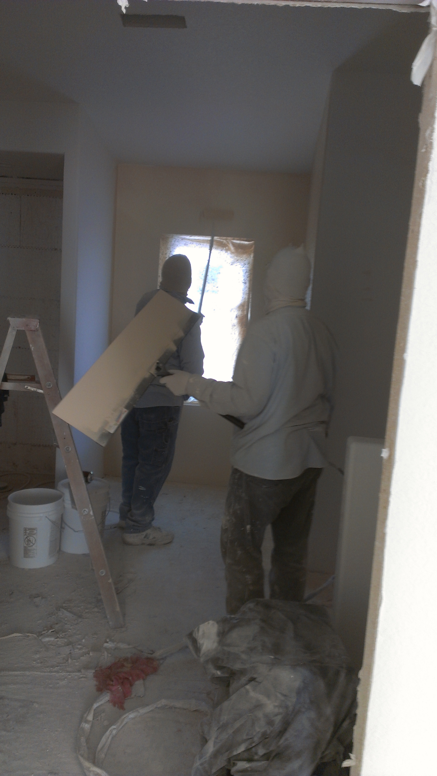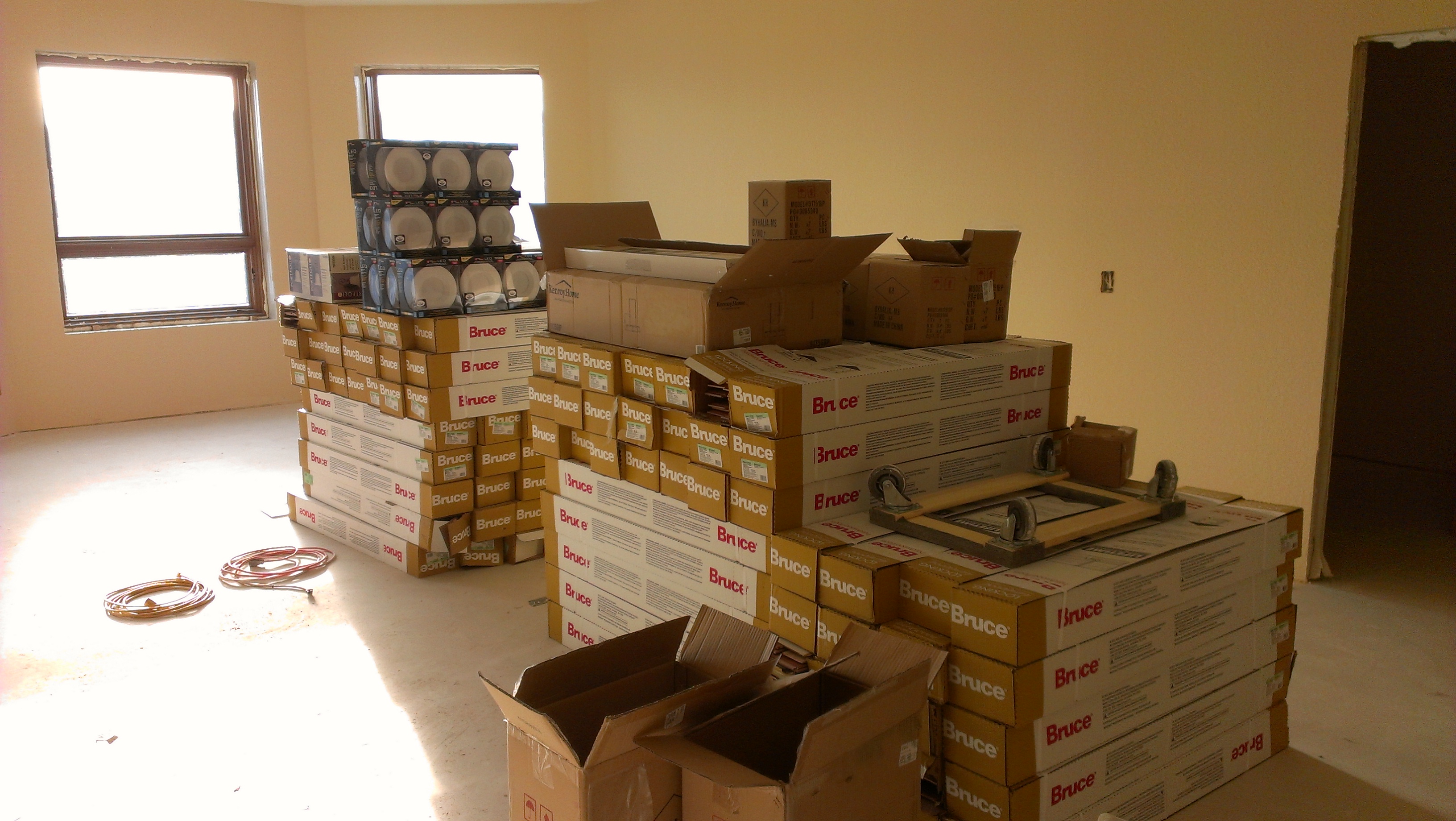 First the sheet rock was put up at floor level, while the tubing was being laid for the in floor heating. Then the gypcrete was poured. The drywallers finished putting up the sheet rock and hand taped and mudded everything (we ran dehumidifiers, electric and propane heaters constantly to dry the floors, walls and keep the place warm in -20 to 30 degree weather for the last month while they worked) They worked on texturing this last week, followed closely behind with primer by our favorite helpers again! The guys (Don and Joe) came BACK again this month and have been priming, painting, fixing, building, installing, running errands and are now putting down flooring… With a tiny bit of card playing if they aren’t asleep when then get back at night.