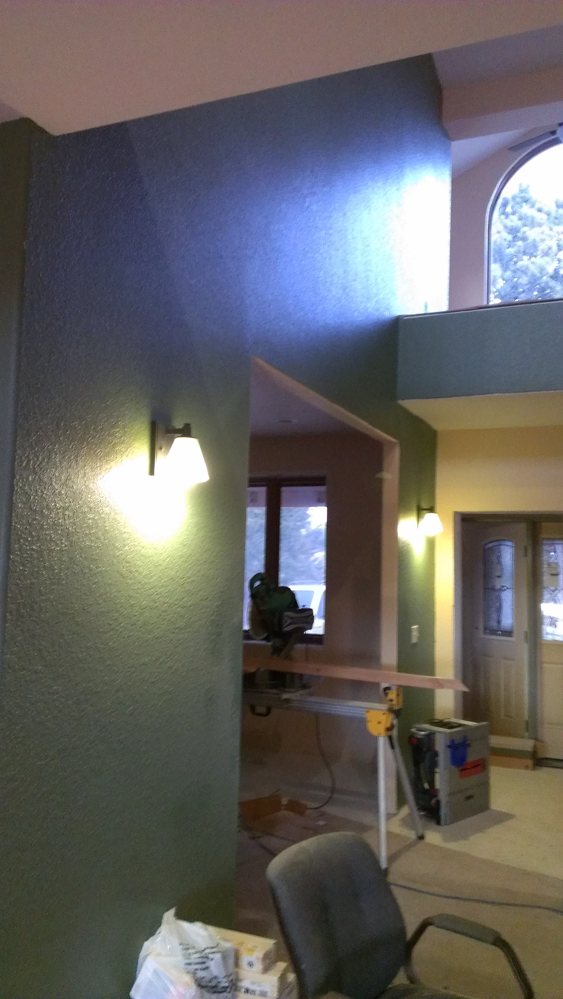 Here is a little view of the green accent walls… there are little bits of green through the whole living area accenting the architecture and creating an art piece. Here you are looking at the living room (between the sconces) above there is an arched window, that is the reading room with the entryway below.
